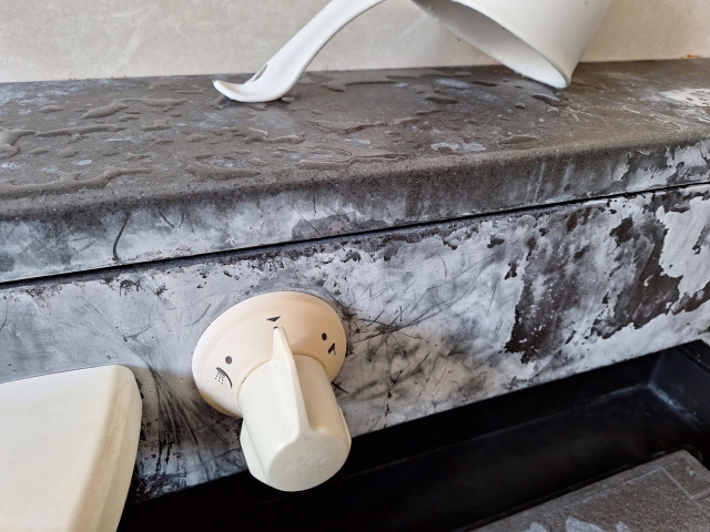 水垢が目立ちやすいのは、水が流れきらずに残りやすい場所です。洗面台の蛇口の付け根、シンクの縁、浴室の棚やカウンターなどは、使ったあとに水滴が溜まりやすく、乾く過程でミネラル分が残ります。